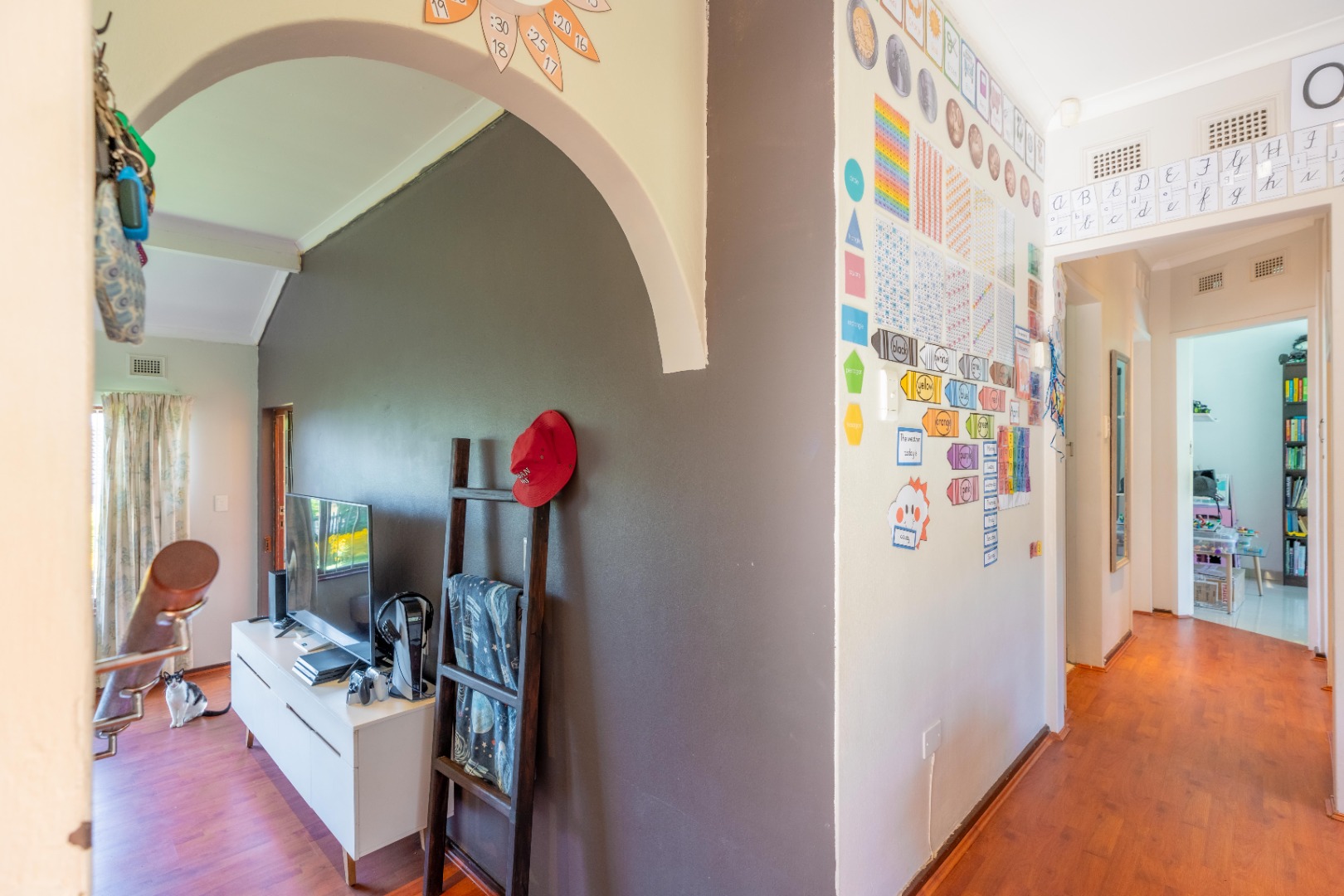 The living spaces are enhanced by consistent laminate wood flooring, while the kitchen and bathrooms feature practical tiling. The kitchen is equipped with wooden cabinetry, dark countertops, a built-in oven, hob, and an extractor fan, complemented by a double sink. The lounge benefits from ample natural light, and a ceiling fan ensures optimal climate control. A notable architectural detail includes an arched entryway connecting the living area to the hallway, which also features built-in storage.