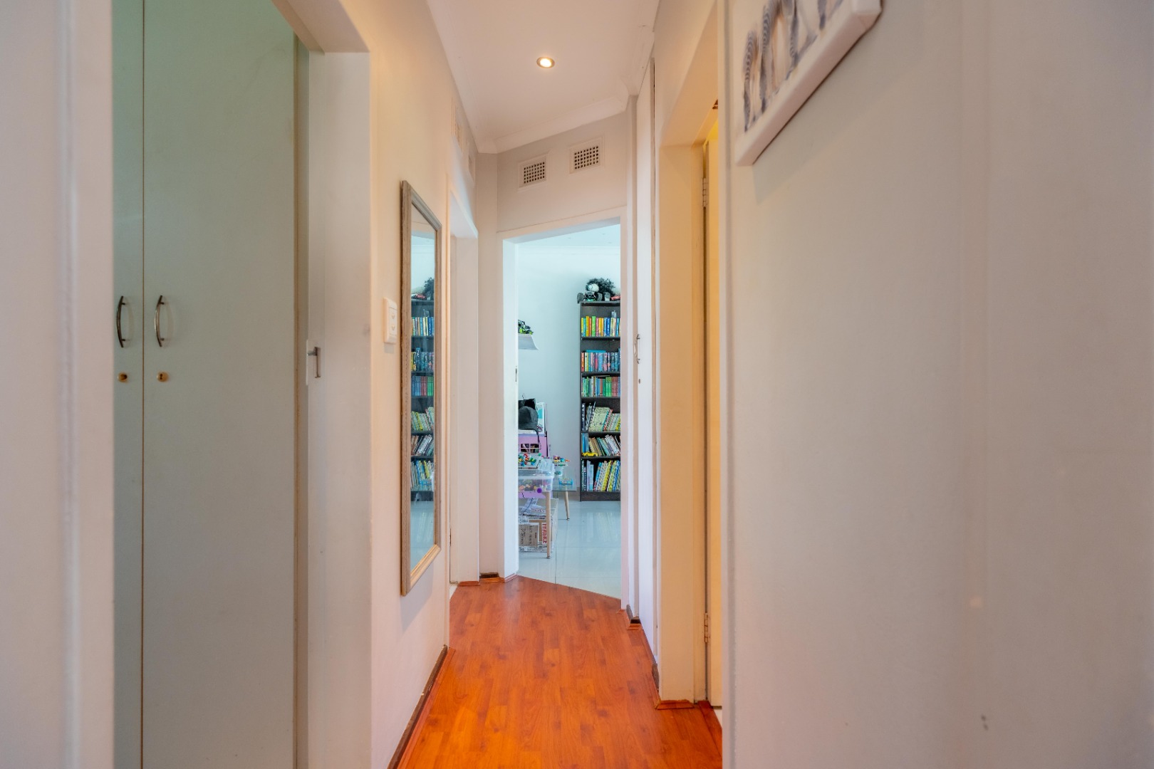 The living spaces are enhanced by consistent laminate wood flooring, while the kitchen and bathrooms feature practical tiling. The kitchen is equipped with wooden cabinetry, dark countertops, a built-in oven, hob, and an extractor fan, complemented by a double sink. The lounge benefits from ample natural light, and a ceiling fan ensures optimal climate control. A notable architectural detail includes an arched entryway connecting the living area to the hallway, which also features built-in storage.